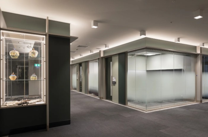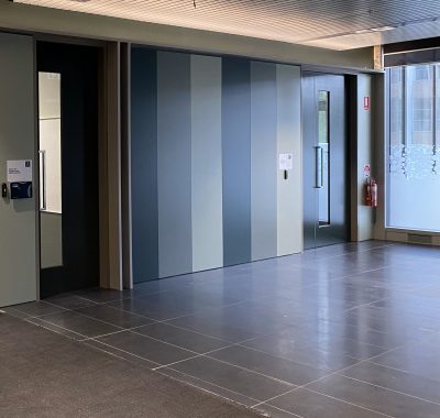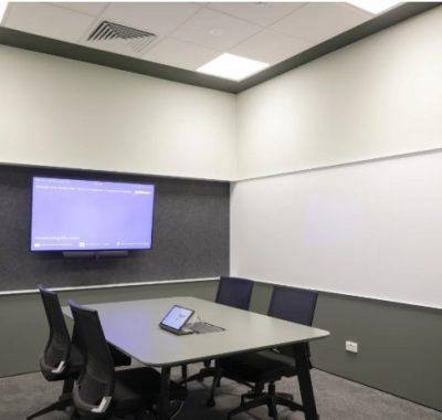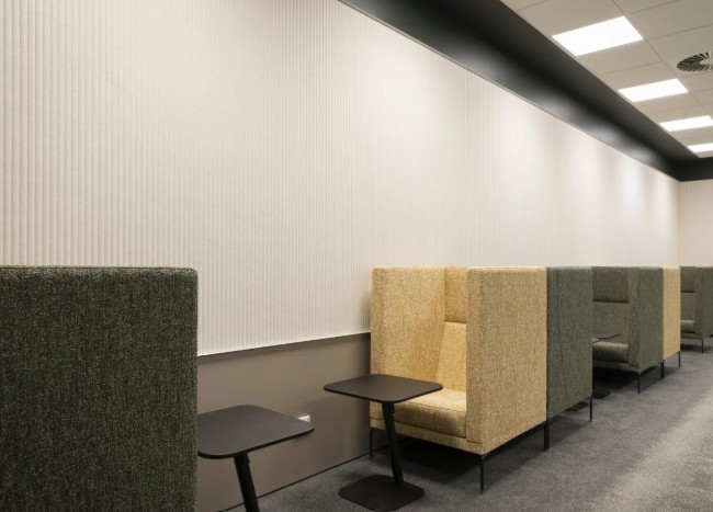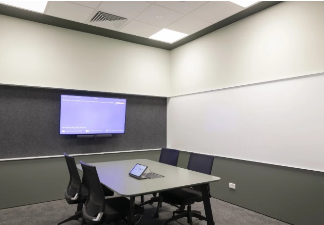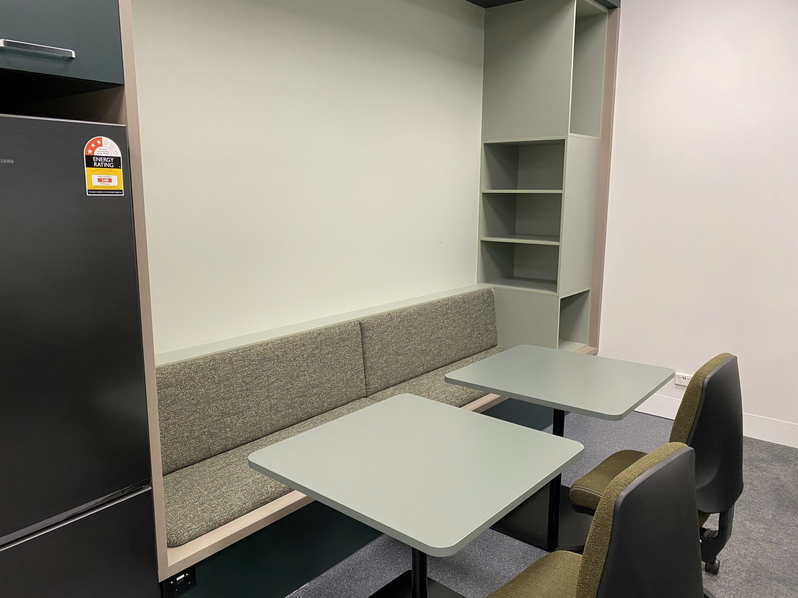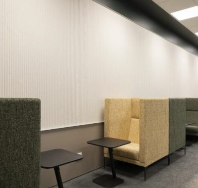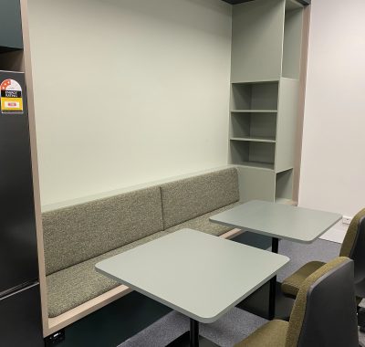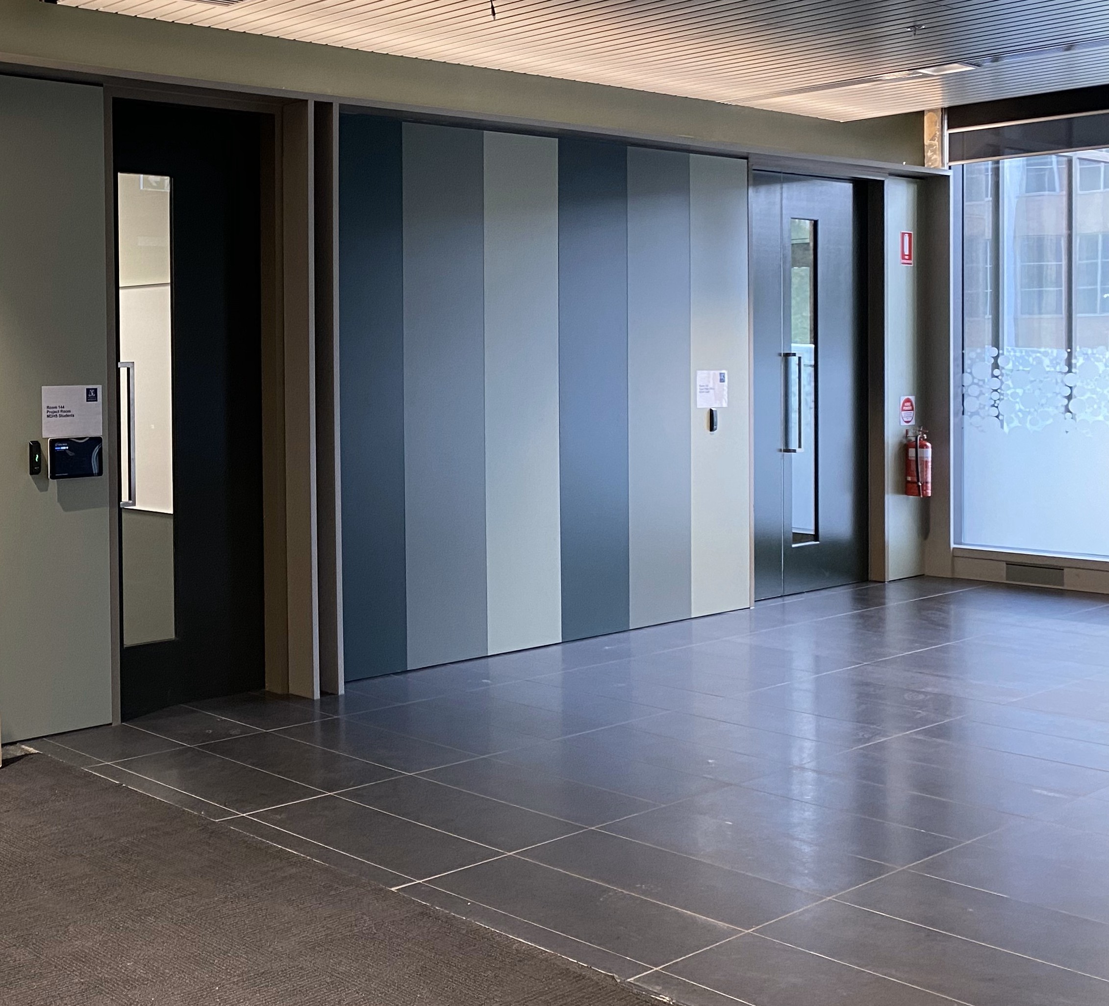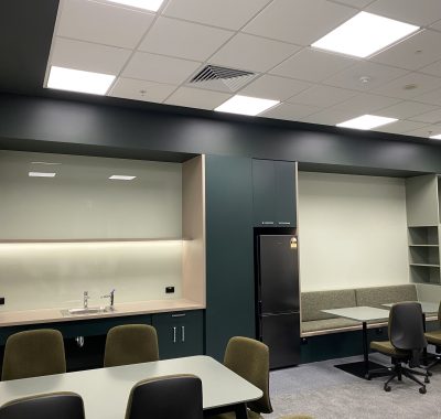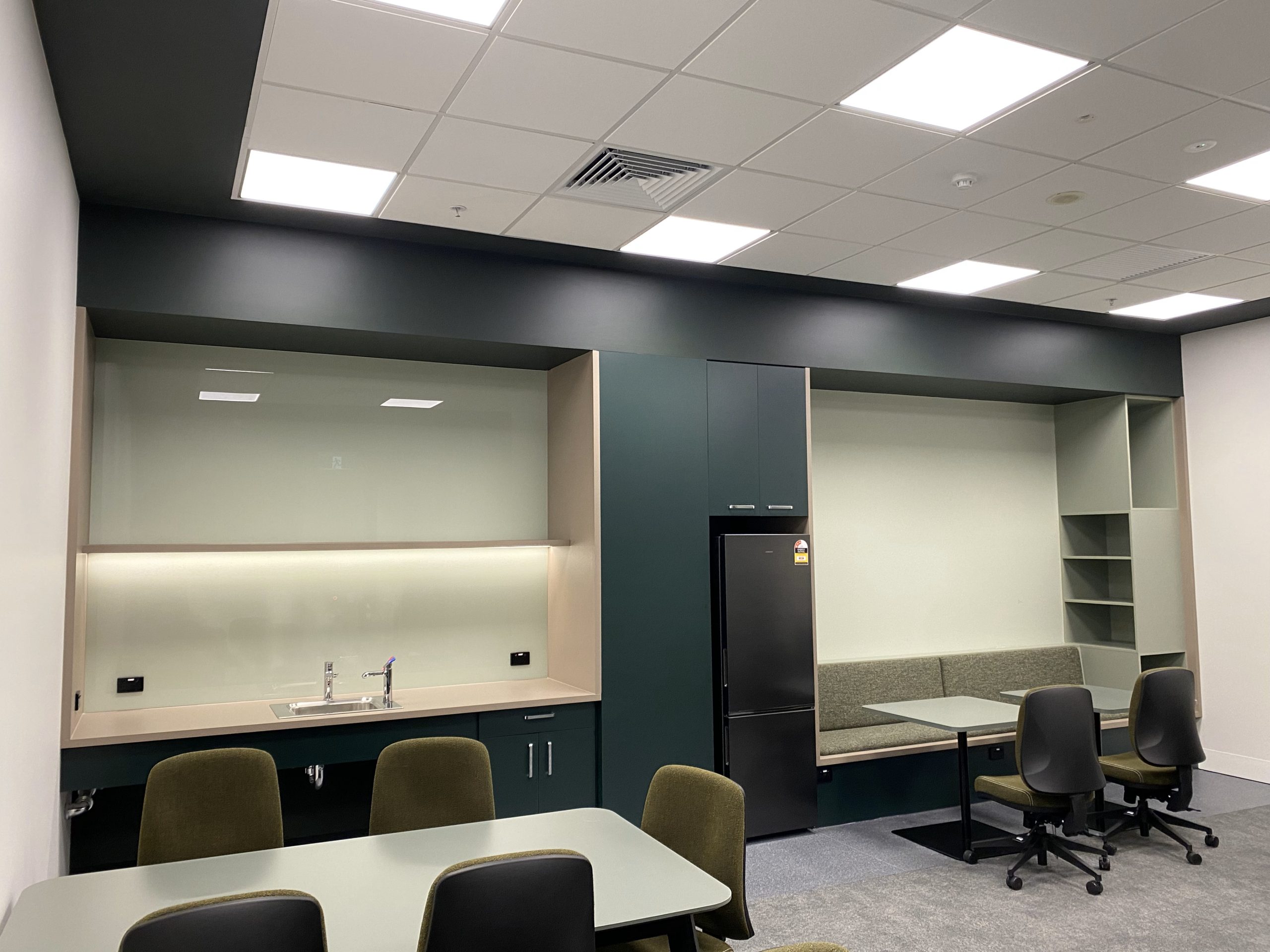 A Large Job by Struxture at University of Melbourne Alan Gilbert Building Level 1 was handled with ease by CFM (Aust). In the study room a different product Forbo Linoleum was used by George Low alongside Laminex Decorated Prefinished Board used on Wall Panelling in funky colours throughout. Classic Echopanel Acoustics and stylish seating throughout. Sleek Kitchen Glass splashbacks supplied by Innovative Glass coatings set off the kitchenette beautifully.